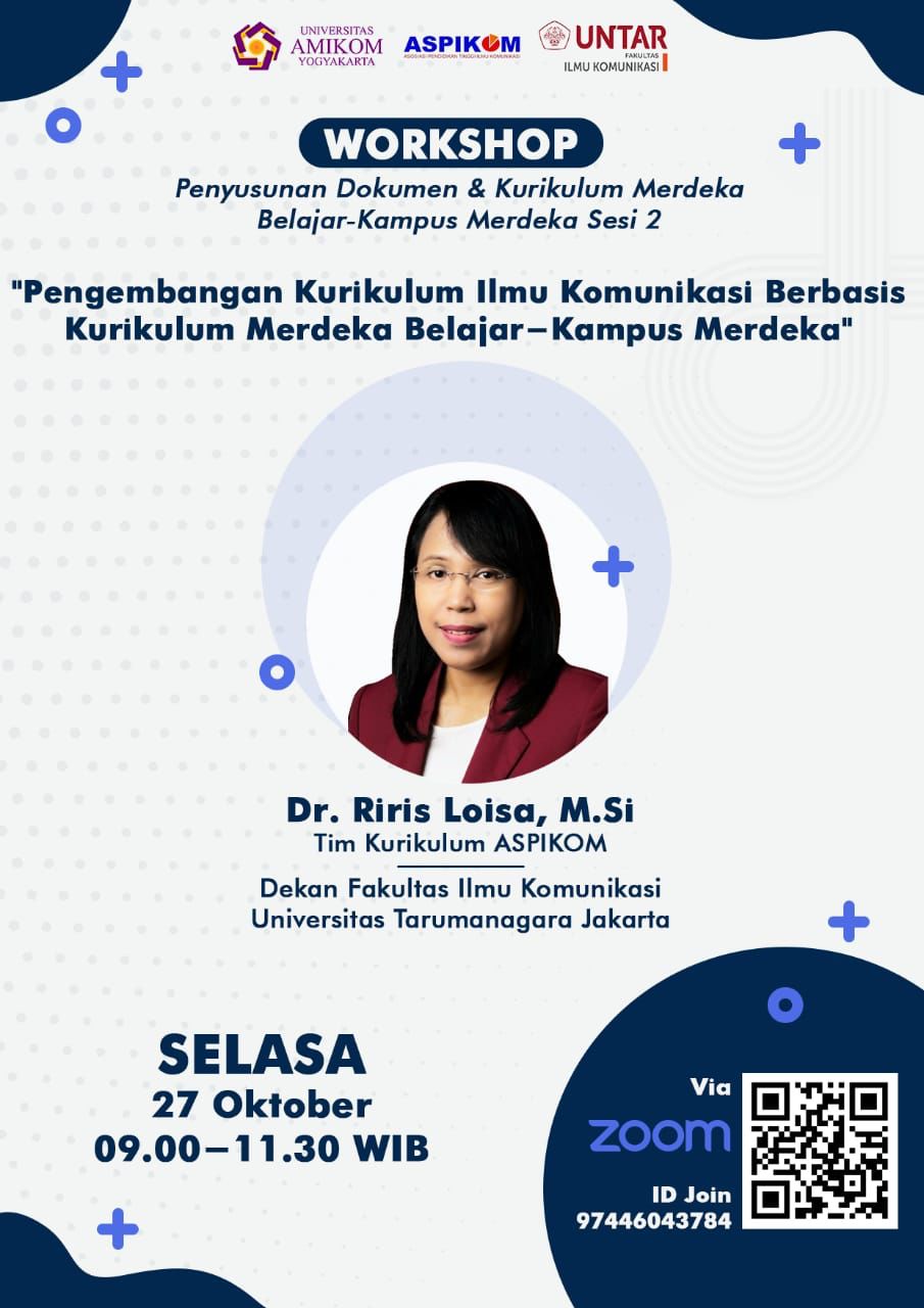 Dalam rangka mengembangkan dokumen kurikulum Merdeka Belajar Kampus Merdeka (MBKM), prodi Ilmu Komunikasi Fakultas Ekonomi dan Sosial Universitas Amikom Yogyakarta telah melakukan Workshop secara daring melalui Zoom pada Selasa, 26 Oktober 2020 pukul 09.00 hingga 11.30 WIB. Workshop ini menghadirkan DR. Riris Loisa, M.Si. sebagai pemateri dalam penyusunan kurikulum berbasis MBKM.