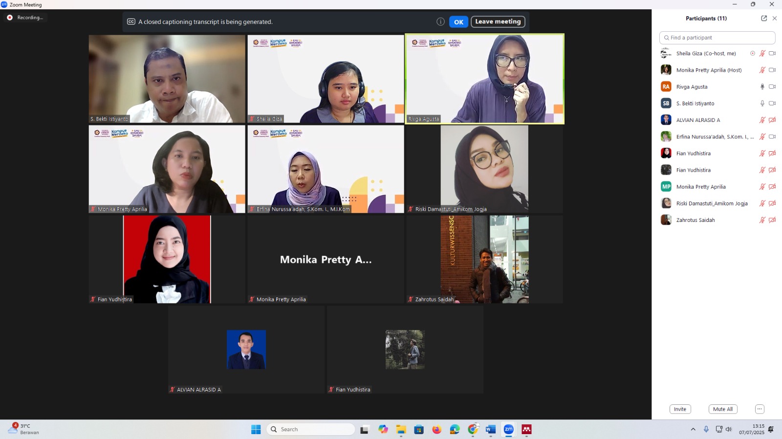 Peserta dalam kegiatan ini adalah tim penyusun Kurikulum 2025 Prodi Ilmu Komunikasi yang terdiri dari dosen-dosen tetap yang tergabung dalam struktur tim pengembang kurikulum. Kegiatan dimulai dengan sambutan dari Ketua Program Studi Ilmu Komunikasi, Rivga Agusta, M.A., yang menyampaikan bahwa tujuan utama dari kegiatan ini adalah untuk mendapatkan masukan konstruktif dari Aspikom terhadap draf kurikulum baru, terutama menyesuaikan dengan arah dan kebijakan baru dari kementerian, serta perkembangan kebutuhan industri dan dunia kerja.